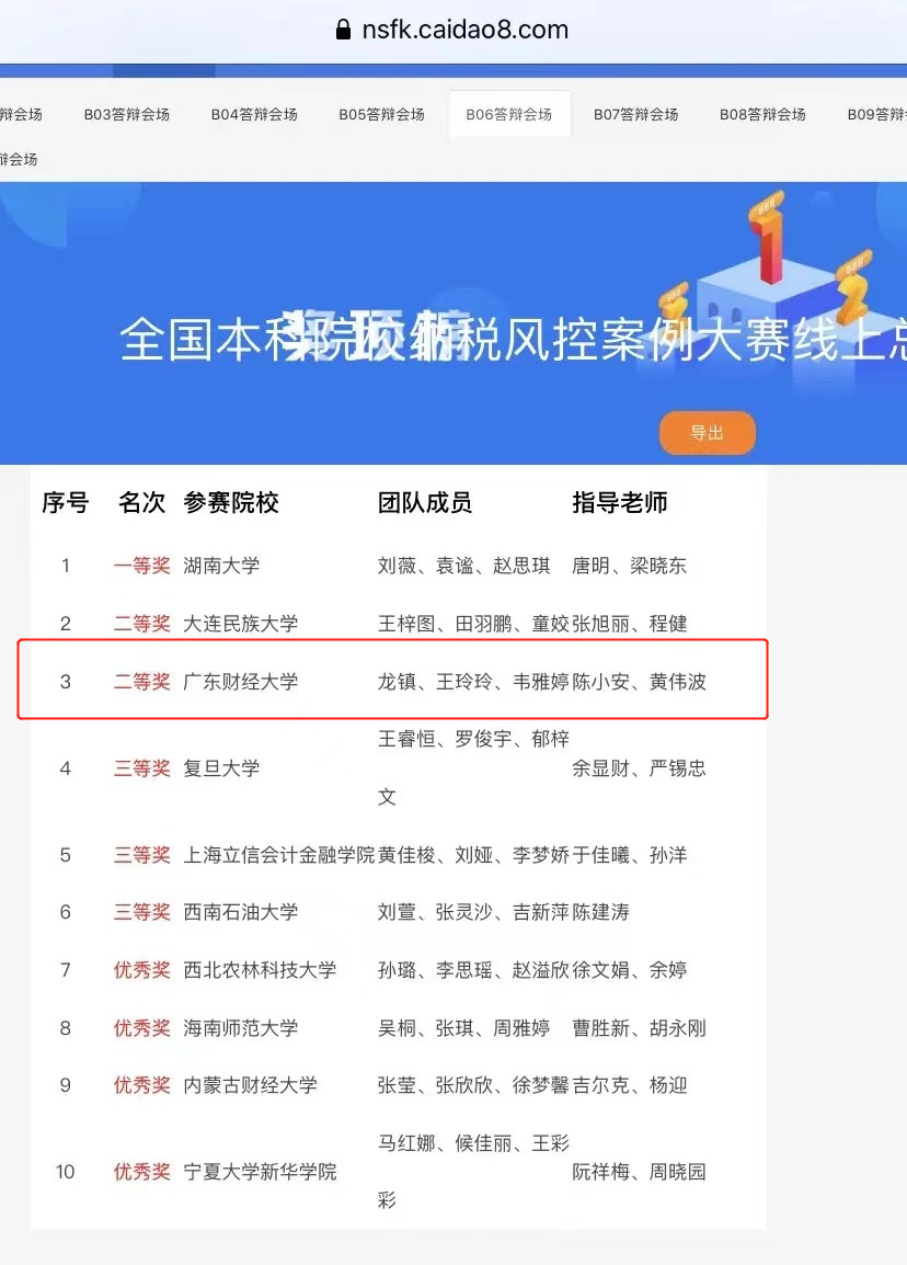 2022年4月15日,财政税务学院由三位同学组成的广东财经大学“税控破案队”在2021年全国本科院校纳税风险管控案例大赛全国总决赛中荣获二等奖!