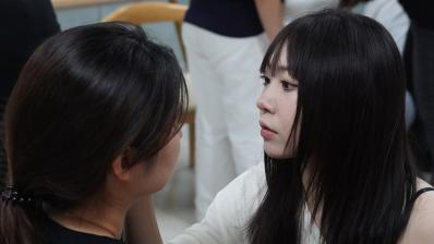 随后的实操演示将活动推向高潮。武欣宇同学以一名学员为模特,进行现场上妆示范。过程中,她不仅逐步演示手法,更即时针对常见问题(如底妆不服帖、眉形勾勒不当等)分析成因并提供实用的补救技巧,使教学更加贴近实际。最受欢迎的互动体验环节中,同学们纷纷动手,或为自己尝试,或为同伴描画,在轻松愉快的互帮互助中巩固技巧,加深理解。
