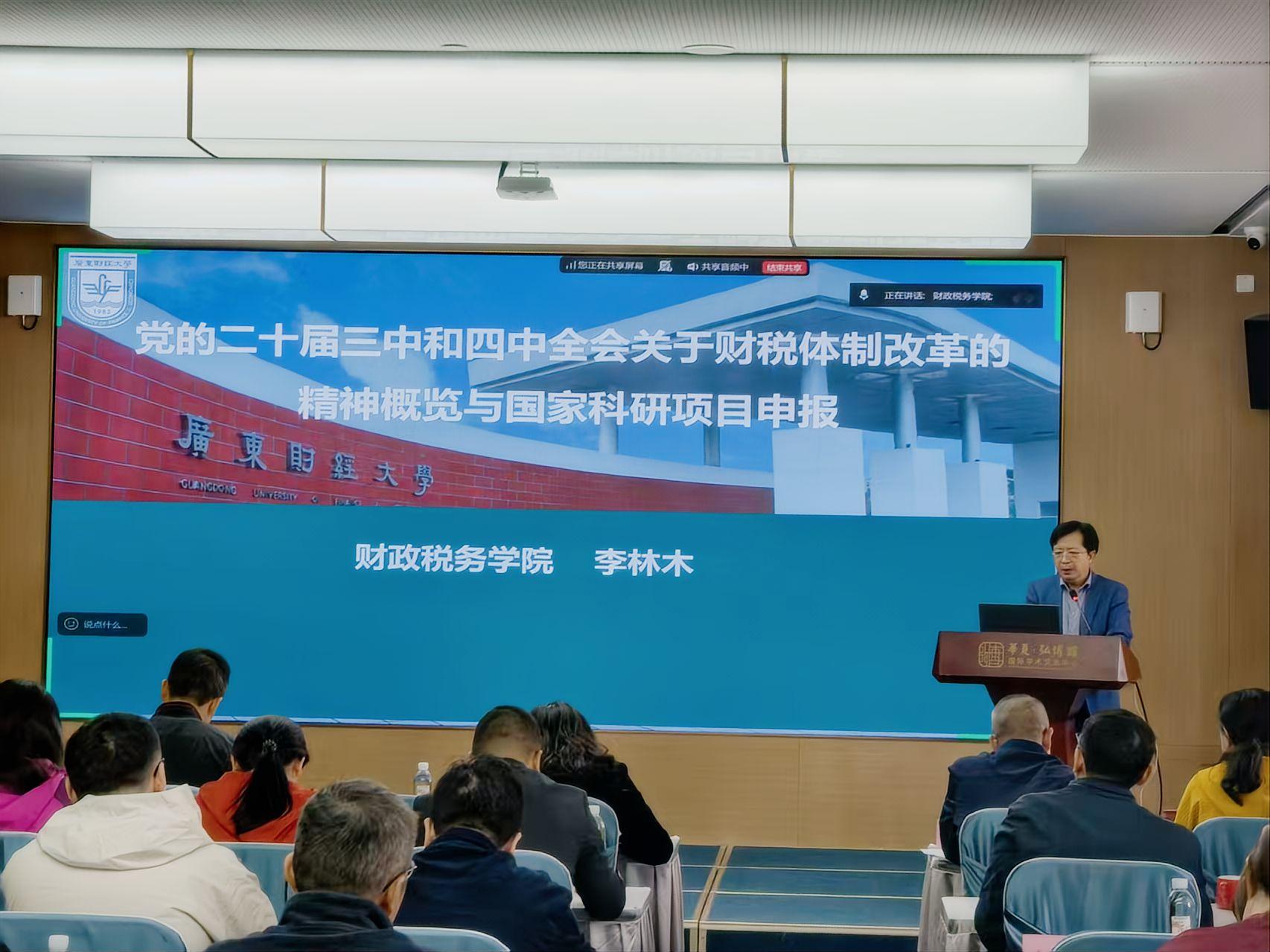 会议第一阶段,院长李林木以“党的二十届四中全会关于财税改革方面的精神及科研项目申报”为主题介绍了新一轮财税体制改革精神,深入浅出地分享了科研项目申报在选题、写作和日常积累等方面的经验和体会,为学院教师如何提升科研能力提供了宝贵的借鉴。孙伟教授作了“国家社科基金申报心得”的主题报告,从选题、研究内容、创新点、学术史梳理和心态等方面作了具体分享。廖丽萍老师结合自身经历就国家自科项目的申报作了经验分享。