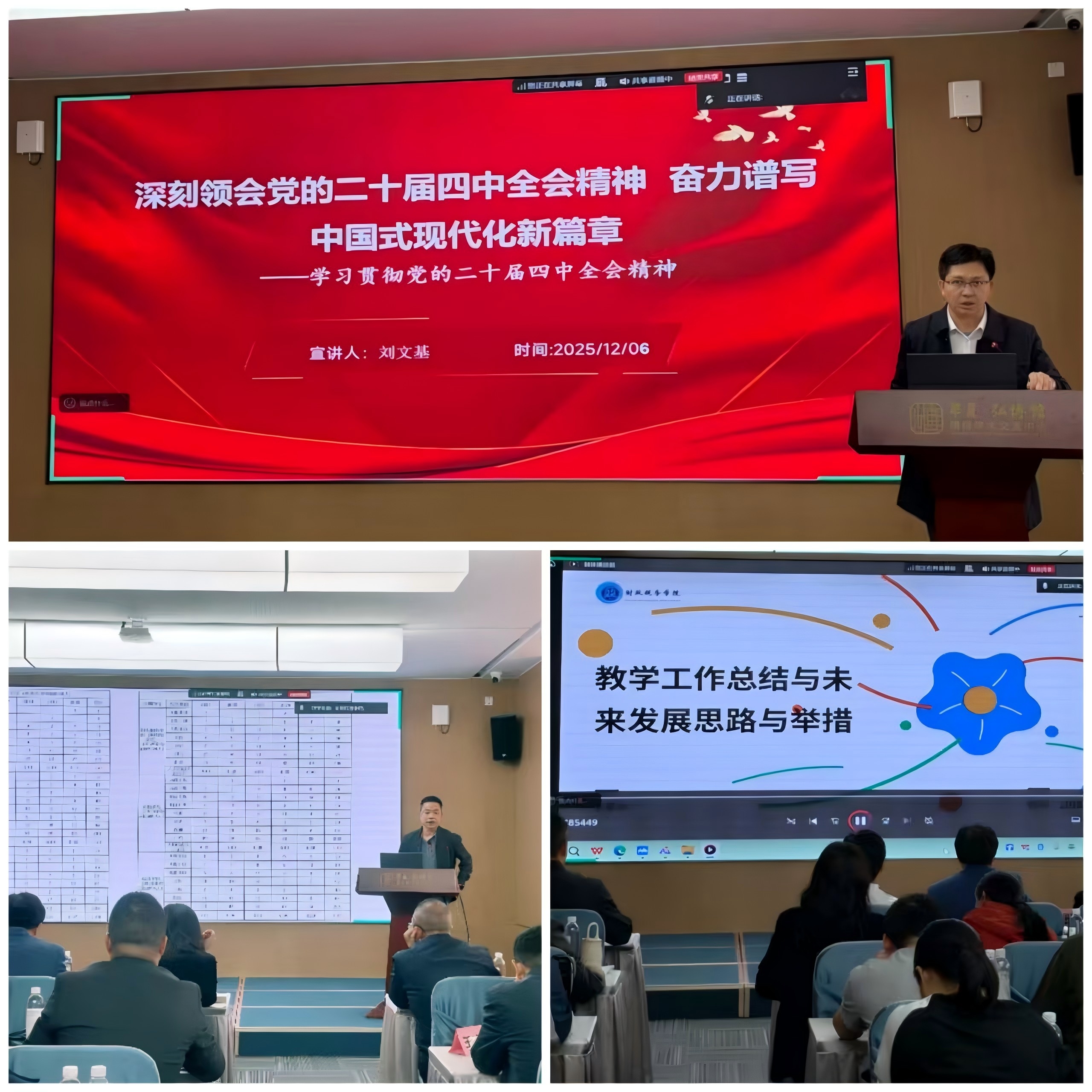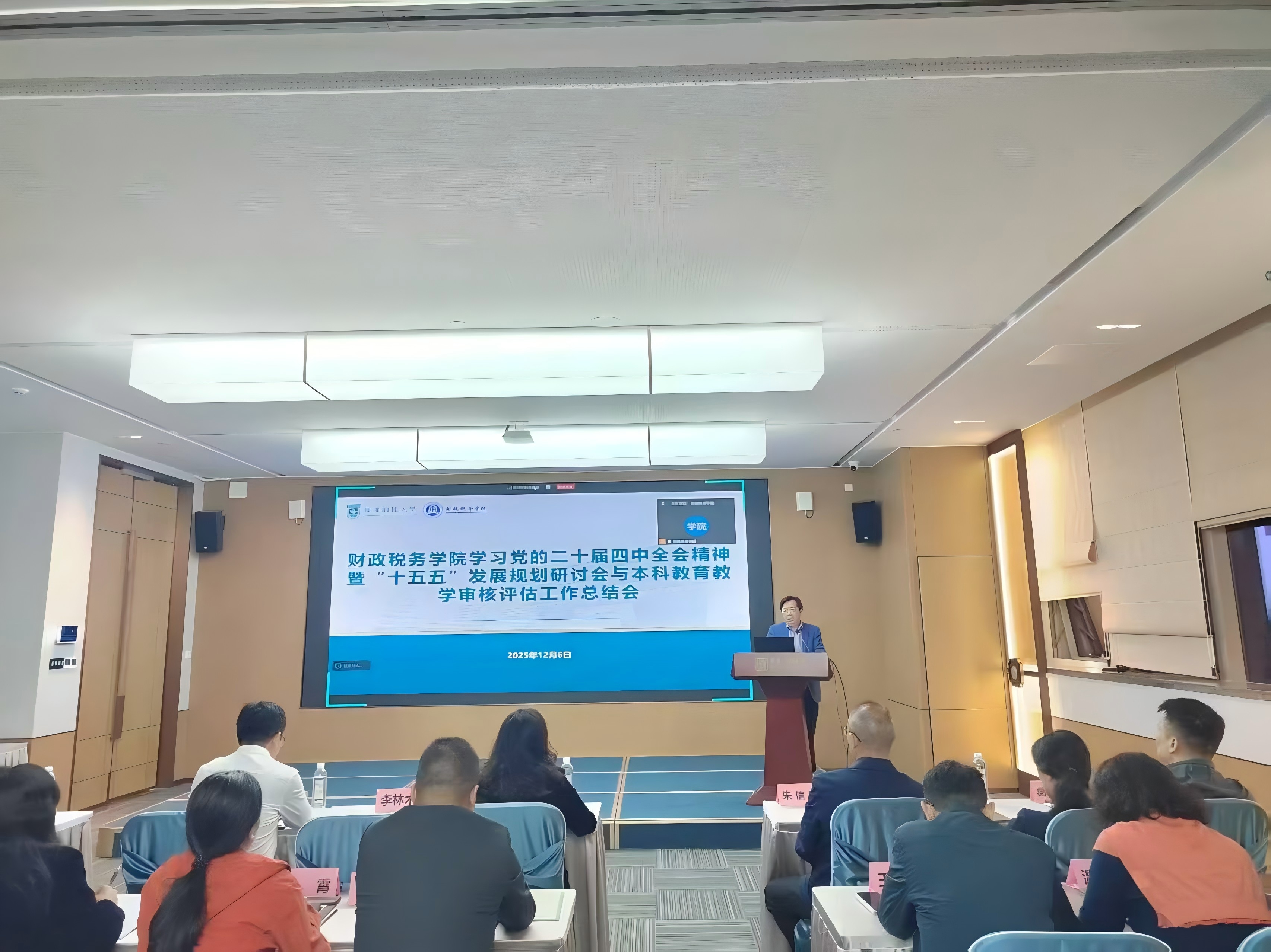 12月6日,财政税务学院利用周末双休日时间召开学习党的二十届四中全会精神暨“十五五”发展规划研讨会与本科教育教学审核评估工作总结会,就深入学习贯彻党的二十届四中全会精神,全面总结本科教育教学审核评估工作以及“十四五”期间学科建设、人才培养、科学研究和社会服务,进一步谋划学院“十五五”期间的发展展开研讨。会议以线上线下相结合的方式组织全体教职工参加,由财政税务学院院长李林木主持。