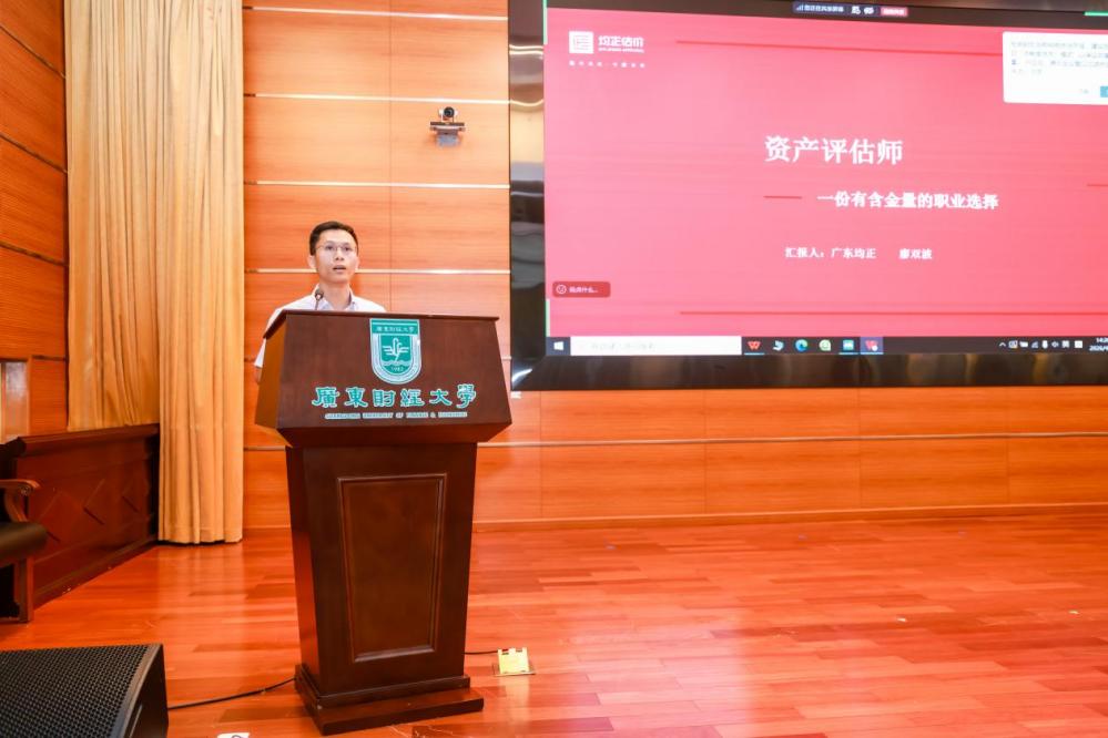 广东均正房地产土地资产评估咨询有限公司总经理廖双波以“一份有含金量的职业选择”为主题展开宣讲,重点阐释了资产评估师在国企改革、资本市场、并购重组等领域的核心价值,深入剖析了资产评估师证书的含金量来源,并详细介绍了考试报名条件、科目与备考要点,鼓励同学们尽早规划、积极报考。